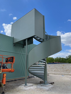 ESCALIER MÉTALLIQUE HÉLICOÏDAL AVEC LIMON TOUTE HAUTEUR FORMANT RAMPE